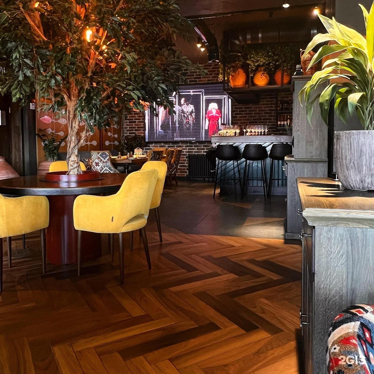 Ресторан в стиле юрты: интерьер с тканями, напоминающими шатры, картинами, топчанами, а ещё с панорамным видом на город. В меню — микс восточных блюд: ташкентская шорпа, том-ям, лагман, мясо на жаровне, плов.